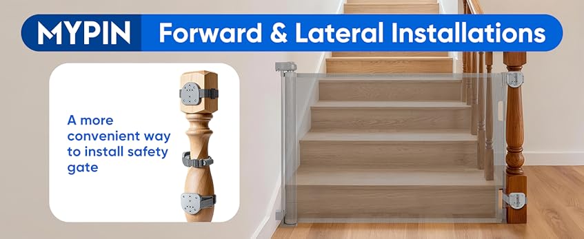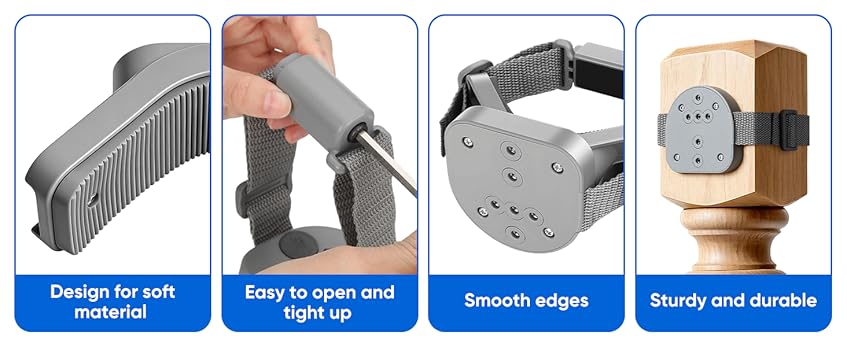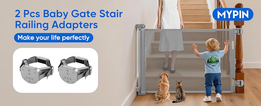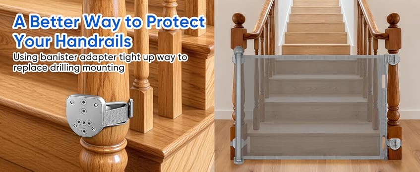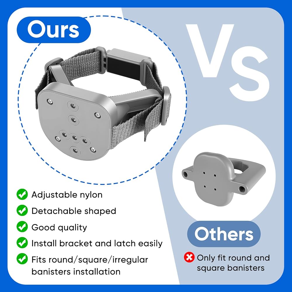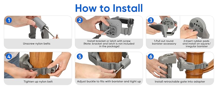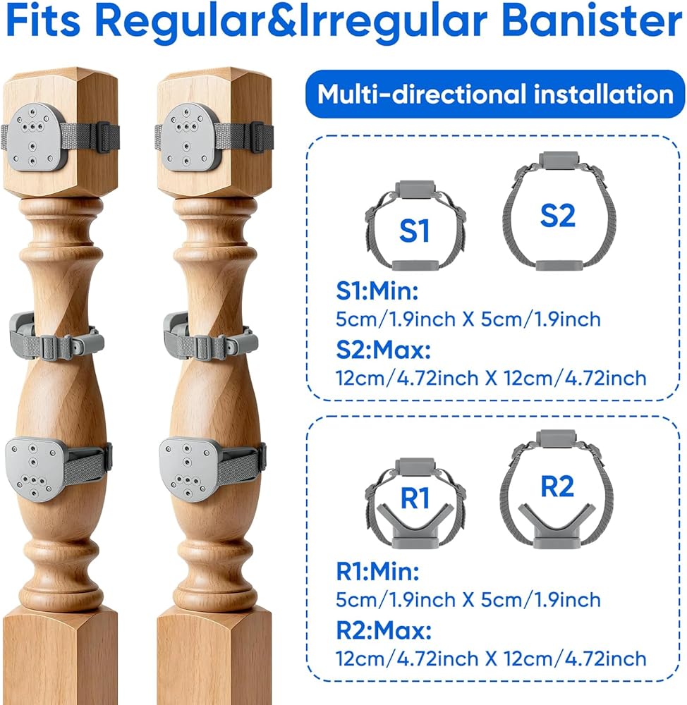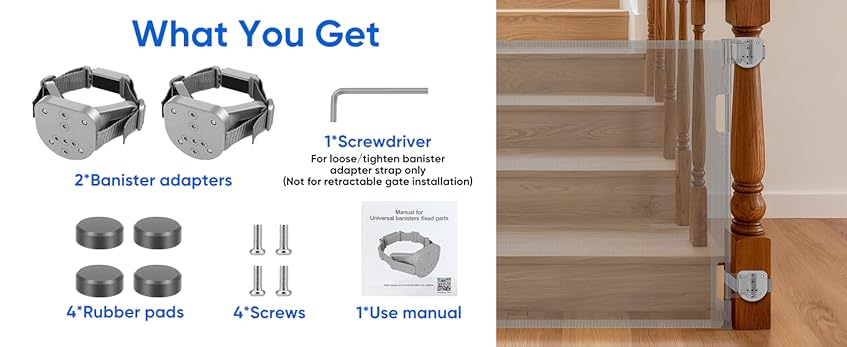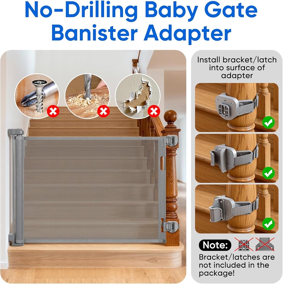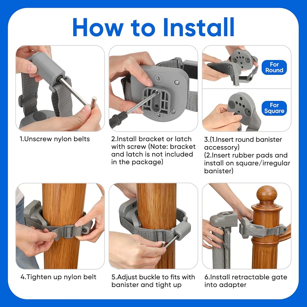 【Easy to Install 】Measure the size of banister, loose and adjust strap to install on the suitable place as you want, then install baby retractable brackets into banister adapter. Warm tips: our product is suitable for one side banister installation, if you need both side to install banister adapters, please order 2 packs.