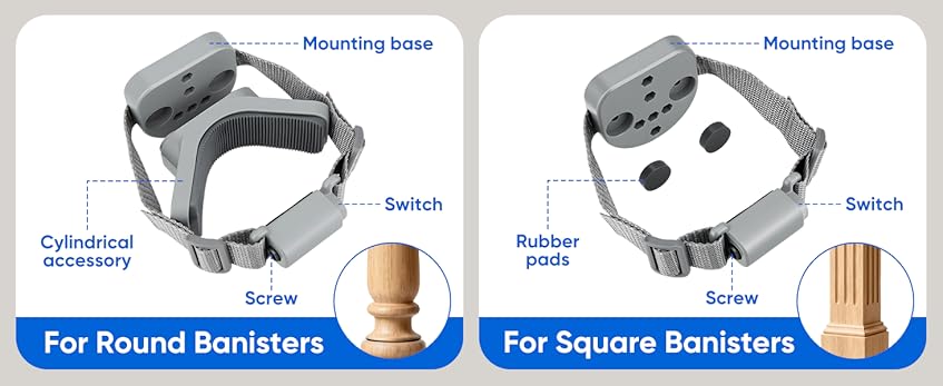 【Limitation of Applicable Size】Our banister adapters are both suitable for round and square railings to use,but need to measure the accurate diameter size of banister, make sure that size of banister is between 1.9”-4.72”(5-12cm) diameter.
