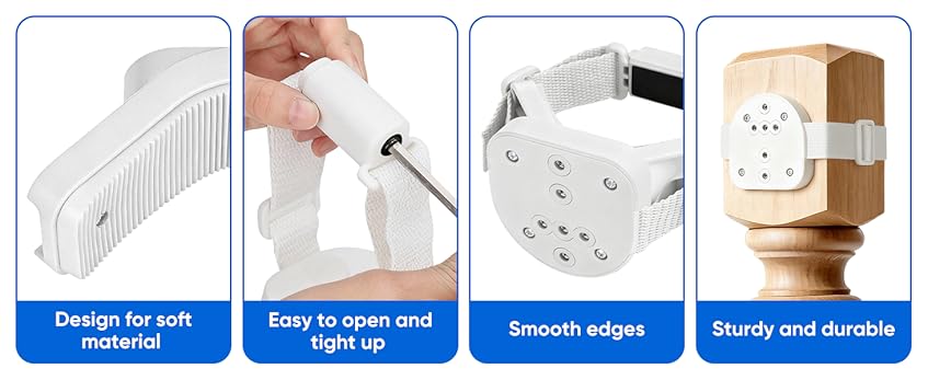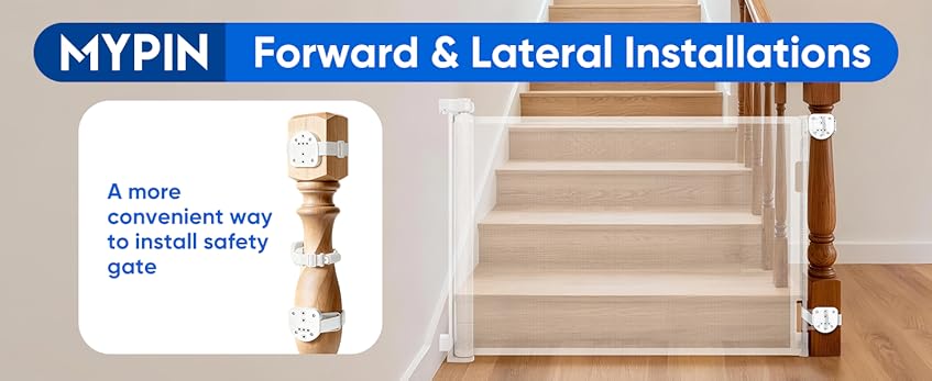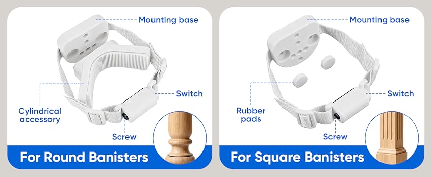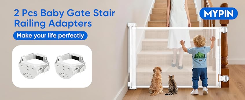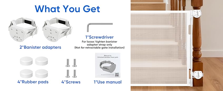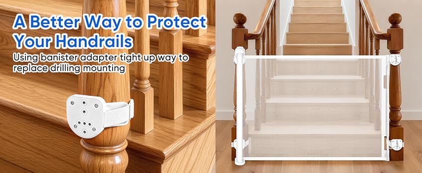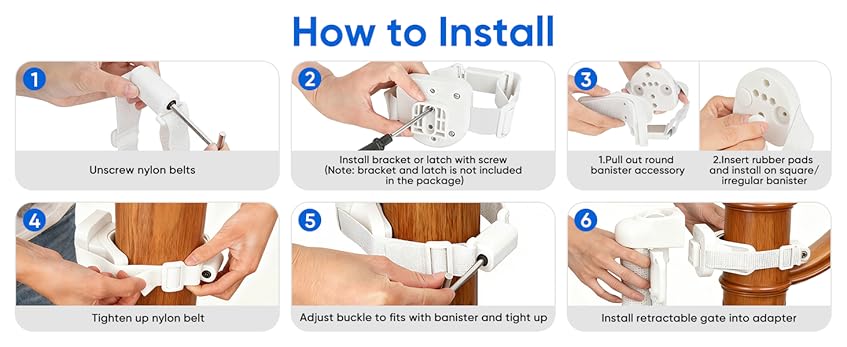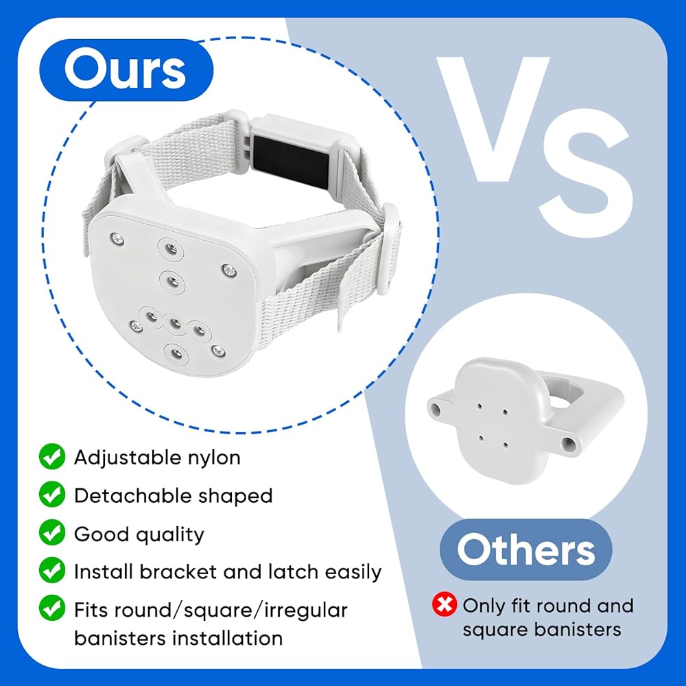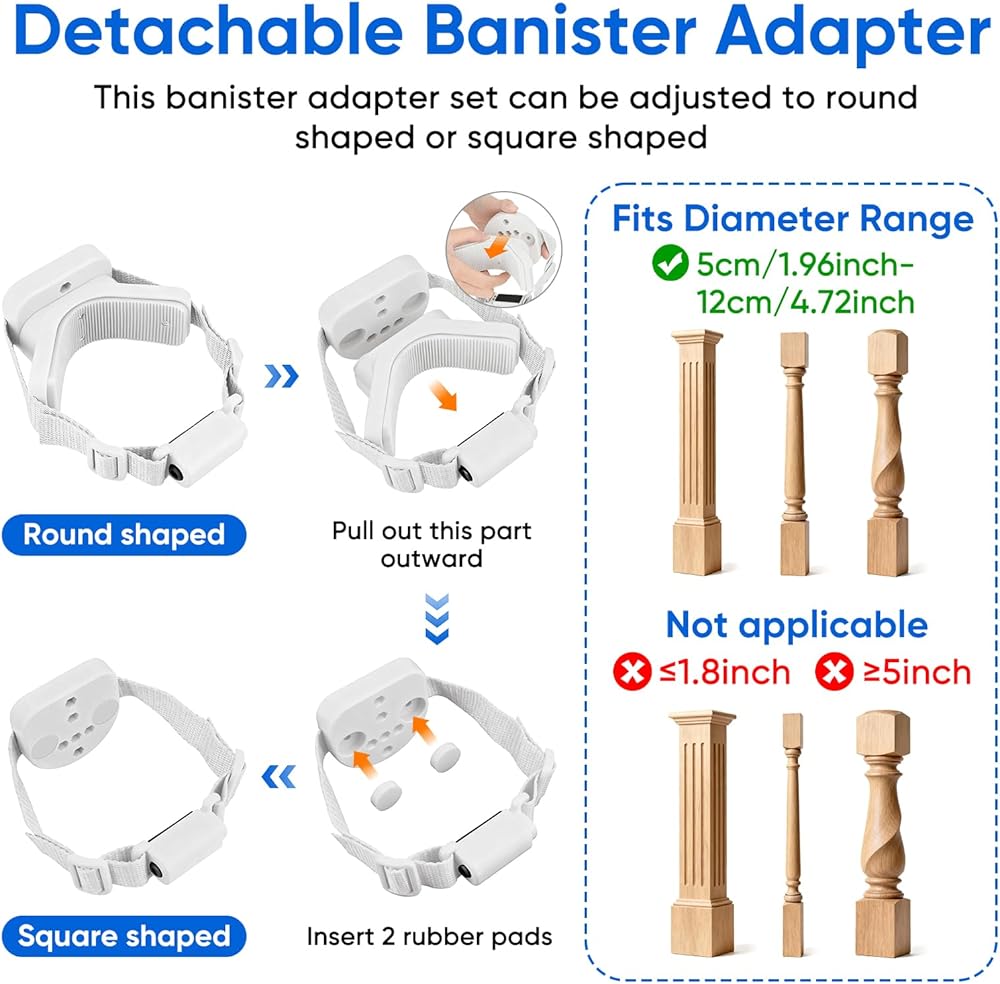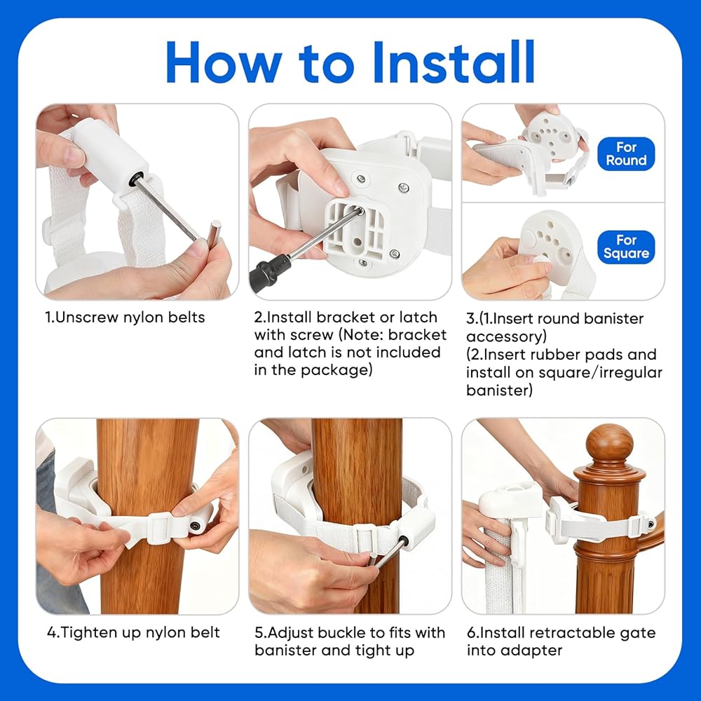 【Easy to Install 】Measure the size of banister, loose and adjust strap to install on the suitable place as you want, then install baby retractable brackets into banister adapter. Warm tips: our product is suitable for one side banister installation, if you need both side to install banister adapters, please order 2 packs.