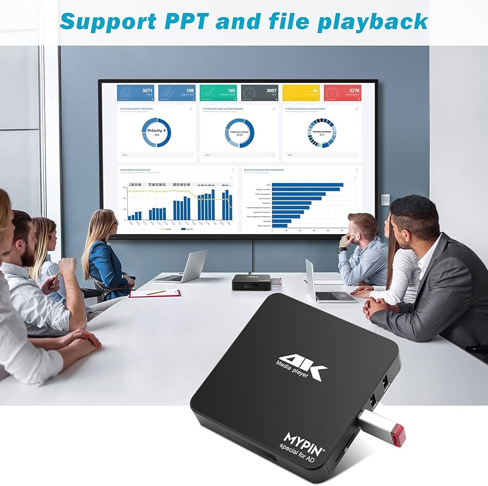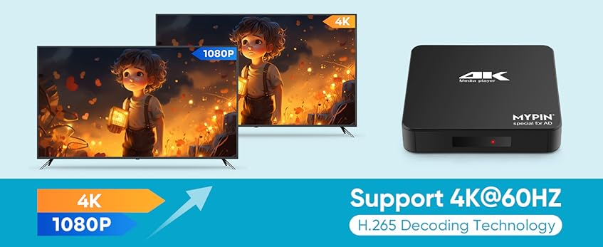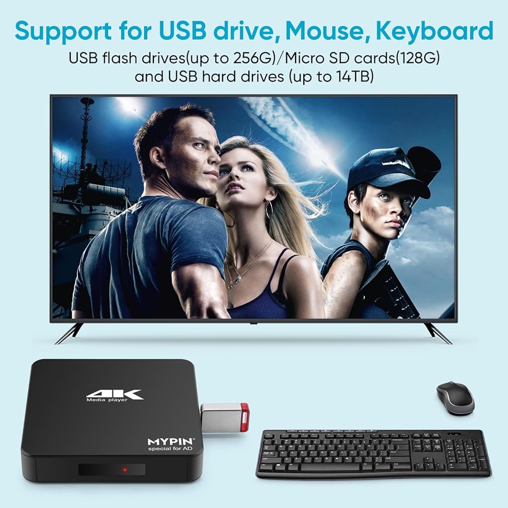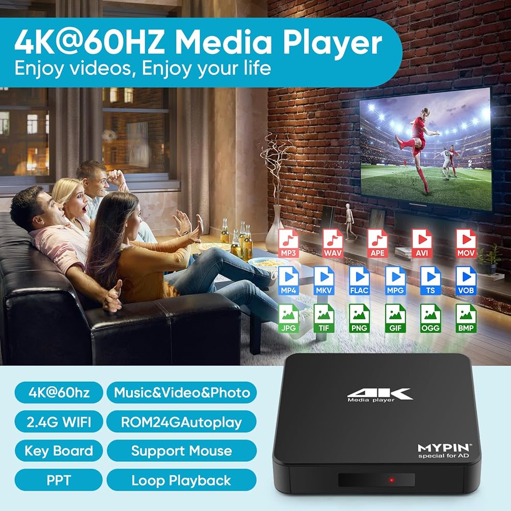 4K@60hz MP4 Media Player Support 8TB HDD/ 256G USB Drive/SD Card with HDMI/AV Out for HDTV/PPT MKV AVI MP4 H.265-Support Advertising Subtitles/Timing, Networkable, Mouse&Keyboard Control