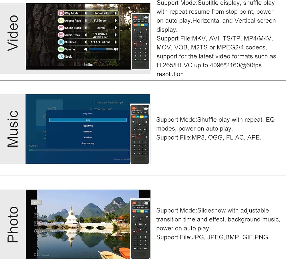 This 4k media player can play various popular videos, music, and photos. It has repeat playback, Automatic Playback and shuffles playback mode; It also reads PPT document. You can choose a variety of play mode: single, sequential. Especially for random playing video, music.