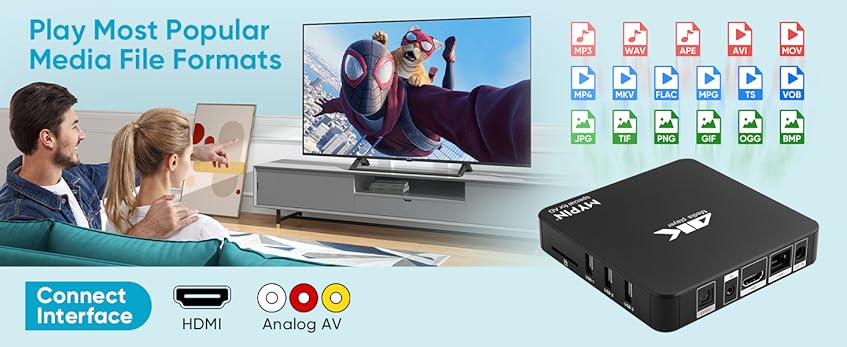 - Package: 1x 4K HD Media Player, 1x Power Supply, 1x AV Cable , 1x HDMI 2.0 Cable , 1x Remote Control (work with AAA battery, not included) , 1x User Manual