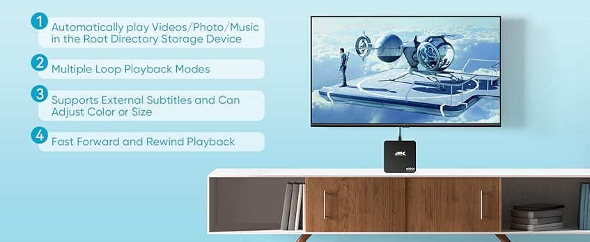【Support Video/Picture/Music/PPT & Auto/loop mode playback】– This 4k media player can play various popular videos, music, and photos. It has repeat playback, Automatic Playback and shuffles playback mode; It also reads PPT document. You can choose a variety of play mode: single, sequential. Especially for random playing video, music. Support video breakpoint and select mode from the beginning, you can start your home theater as you like. NOTE: NO random play for photos.