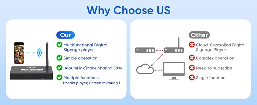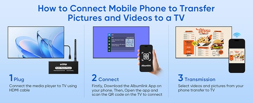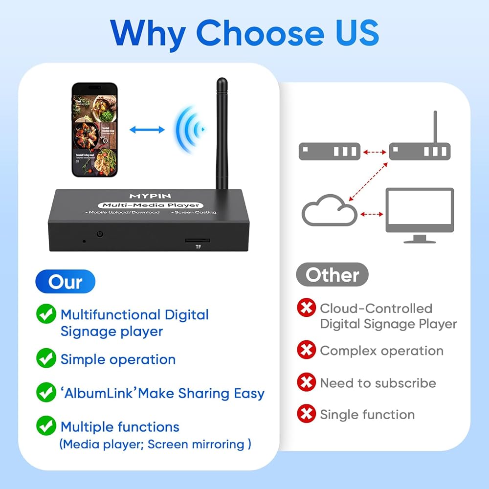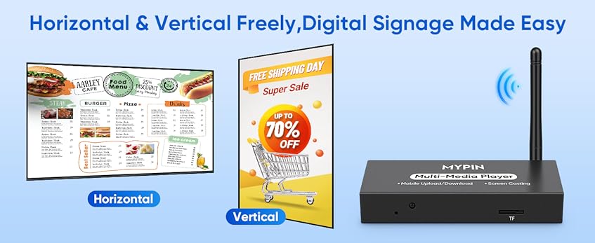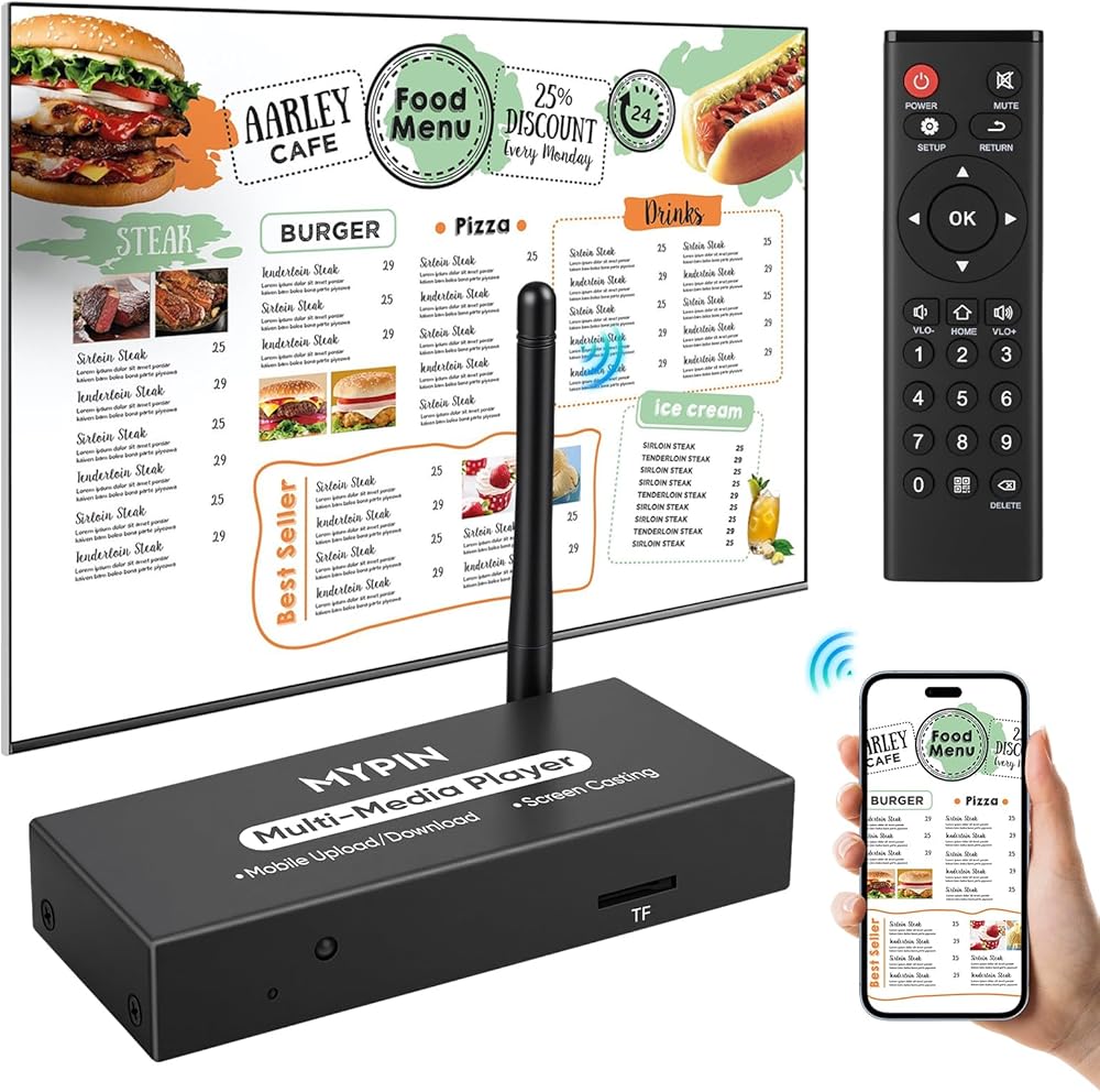 【Smart APP Control and Transmission】No account creation is needed. Scan QR code connectivity and mobile app:AlbumLink simplify operate,You can easily transfer advertising slogan images and videos from your phone to your TV, or use your phone as the remote control for our device to adjust the volume and play images and videos,Support one mobile phone to control multiple advertising machines or multiple mobile phones to control one advertising machine,Perfect for restaurants, retail stores, and corporate environments needing dynamic digital display boards.