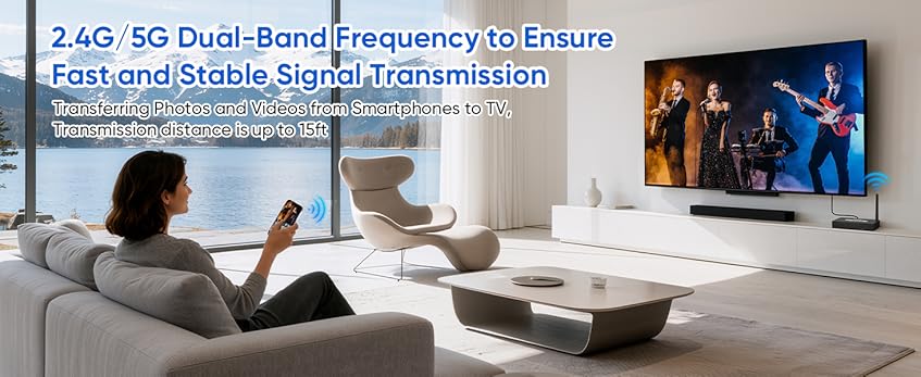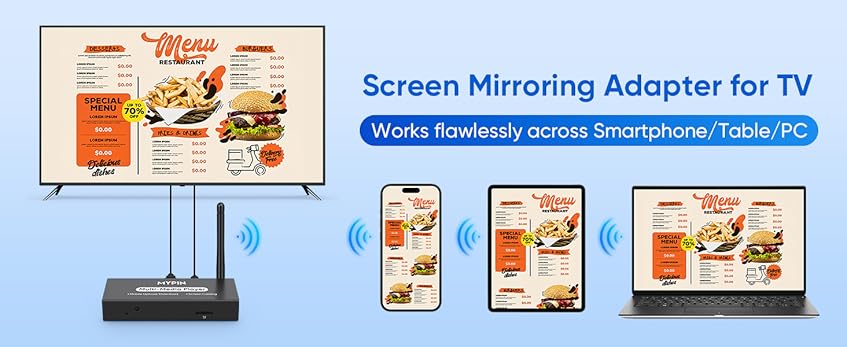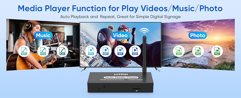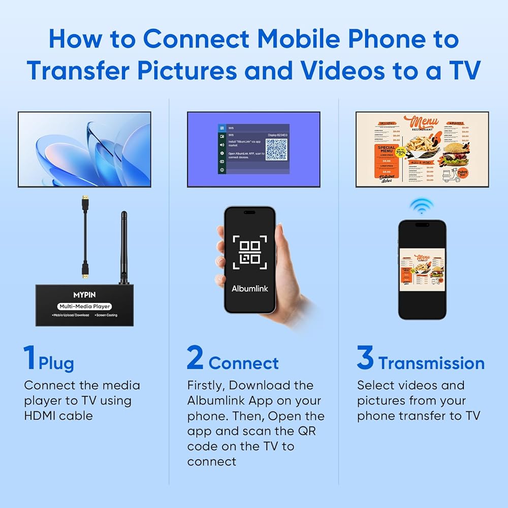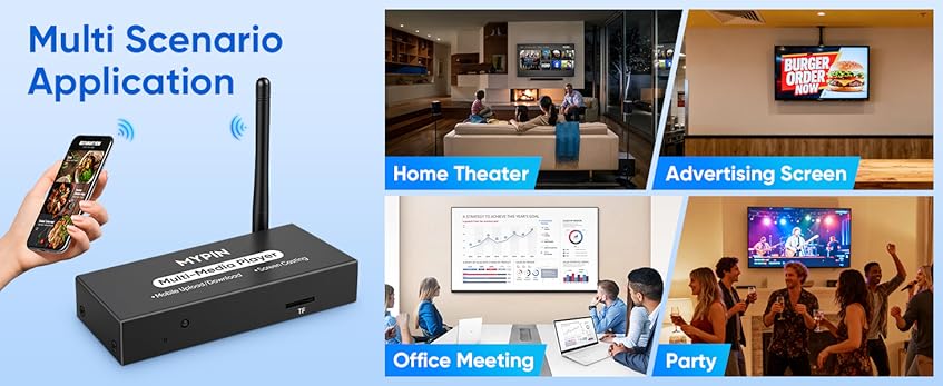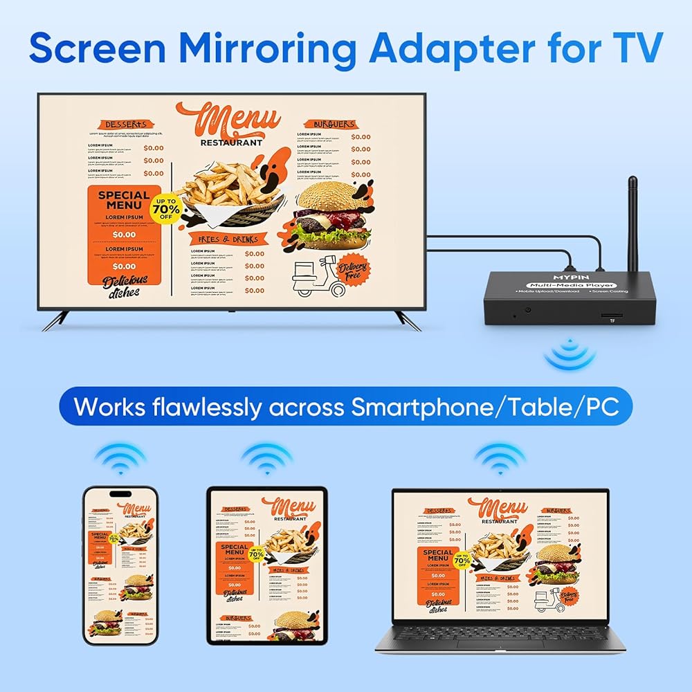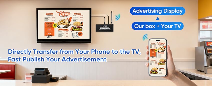 【Make Your TV set become AD Display】Plug our digital media player into any HD TV,By connecting your phone to our machine, you can easily transfer advertising images or videos from your phone to TV, turning it into an intelligent advertising machine that can play and transmit instantly, making it more convenient and efficient.Get a connection that can withstand any fast transmission you want through 2.4/5GHz dual band.(Note:Transmission distance within 15ft)