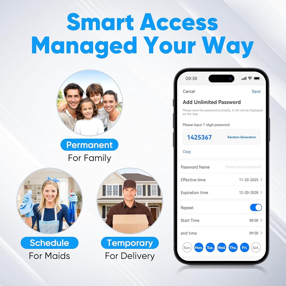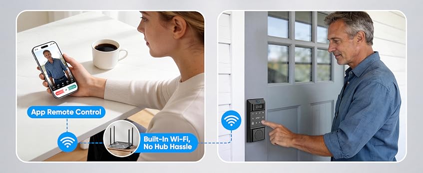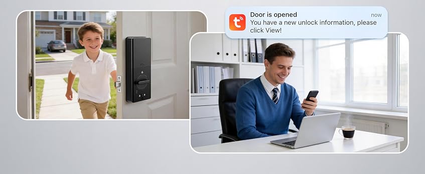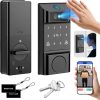 - 【Smartphone Control with Built-in Wi-Fi & Video doorbell Function】Through the TUYA app, you can fully control your smart lock anytime, anywhere without needing a bridge device. Remotely lock or unlock your door, share or revoke access permissions for others, check lock/unlock logs, generate one-time passwords, engage in two-way video and voice intercom, and easily monitor activity. Built-in Wi-Fi ensures your keyless door lock stays connected reliably. (Supports 2.4G Wi-Fi only)