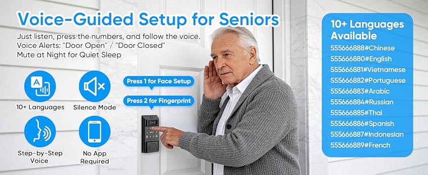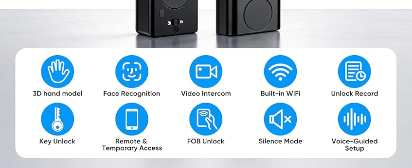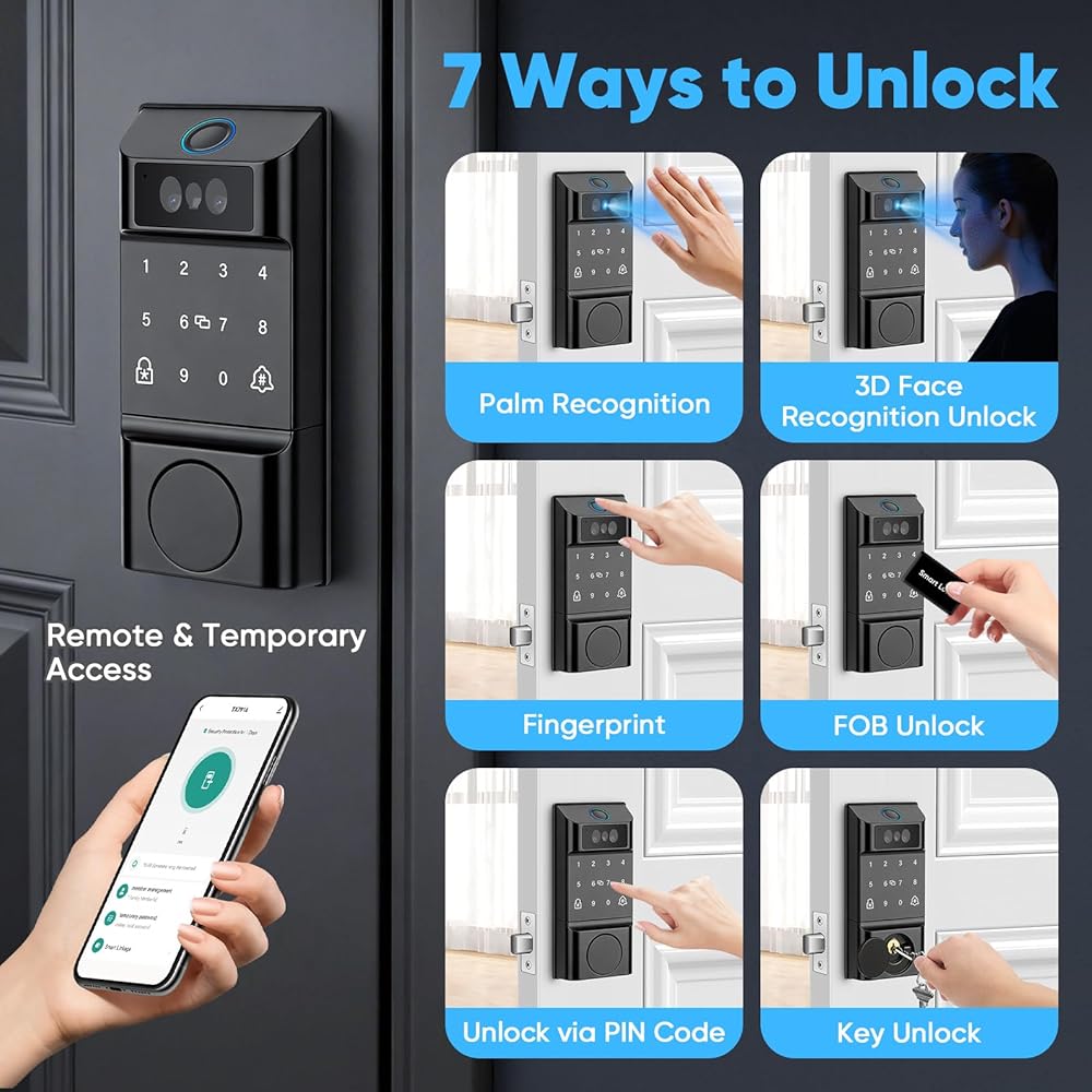 - 【Your Face/Hand is Your Key, 8-in-1 Smart Access】Unlock your door via face, palm vein, fingerprint, PIN code, app, fob card, alexa voice, or mechanical keys. Perfect for multi-generational families, guests, and Airbnb hosts. All your facial/hand/fingerprint data is encrypted and stored securely on the device, ensuring privacy and safety for your home.