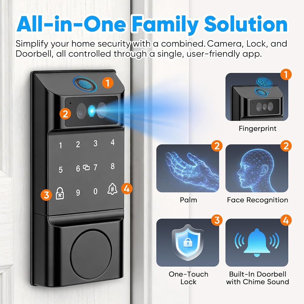 Smart Lock with Palm Vein&Facial Recognition& Fingerprint Keyless Entry Door Lock, Built-in Wi-Fi Deadbolt with Security Camera& Video Doorbell, App Control, Auto-Lock, Touch Keypad for Home Security